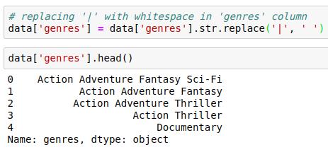 ● In the ‘genres’ column, replacing the ‘|’ with whitespace, so the genres would be considered different strings