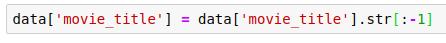 ● One more operation we need to perform on the title column. All the title strings has one special character in the end, which will cause problem while searching for the movie in dataset. Hence removing the last character from all the elements of ‘movie_title’.