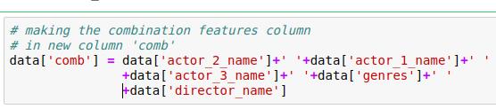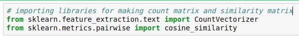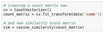 ● Now after getting all the features summed up in one column in text form. We can make a similarity matrix. For making a similarity matrix, first we have to create count matrix of features.