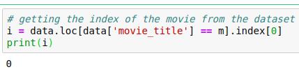 ● Now, get the index of the movie in the dataset. Then fetch the row on the same index from the similarity score matrix, which has the similarity scores of all the movies to the movie user like.