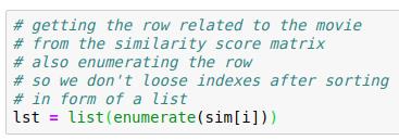 ● In the above step we also enumerated the row of similarity score, because for the most similar movies we have to sort this list in descending order, but we don’t want to lose the original index of similar movies, hence enumerating is important.