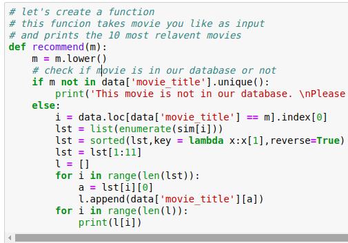 ● Now we have the indexes of ten most similar movies to the movie user likes in the list. We just need to iterate through the list and store movie names on the indexes in a new list and print it.