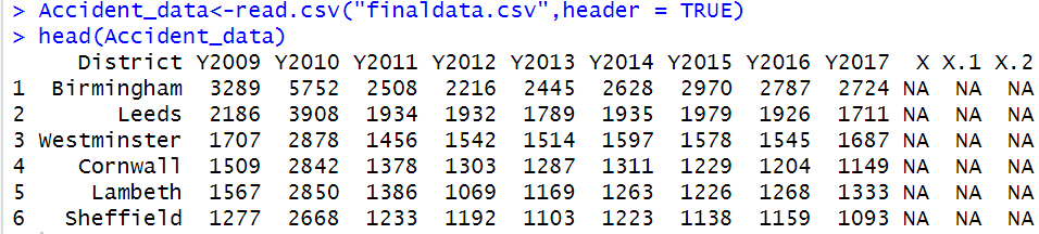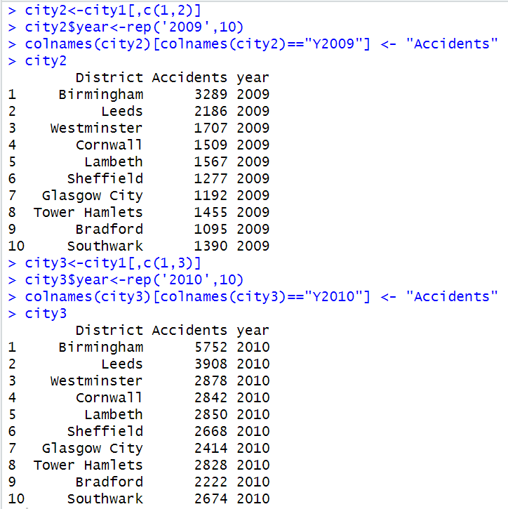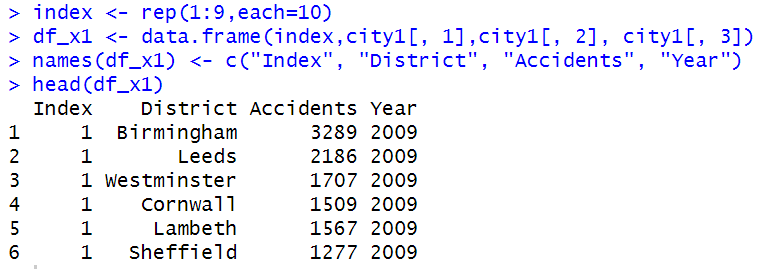 In the first line of the code we created a data frame that takes all the rows and only two columns of our working dataset. In the next line we have created another column which replicates the year given as input in rep() function for ten times. The third line of code in the set of the code change the column name that takes in the number of accidents city wise to ‘Accidents’ variable name. And next code is to display the resulting dataset we have created through rest of the codes of the series.