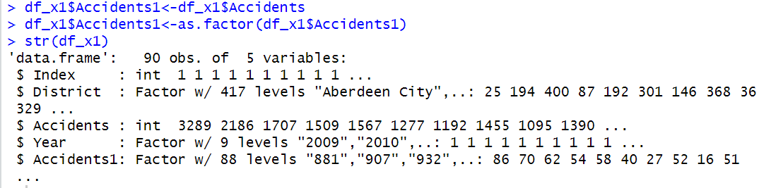 In the next step, we will create a duplicate column of the ‘Accidents’ column and name it as ‘Accidents1’. The type of the new column created is changed to the ‘factor’ type with the help of as.factor() function. Check for the data types of all the columns of the dataset with str() function. These codes are executed in the following manner: